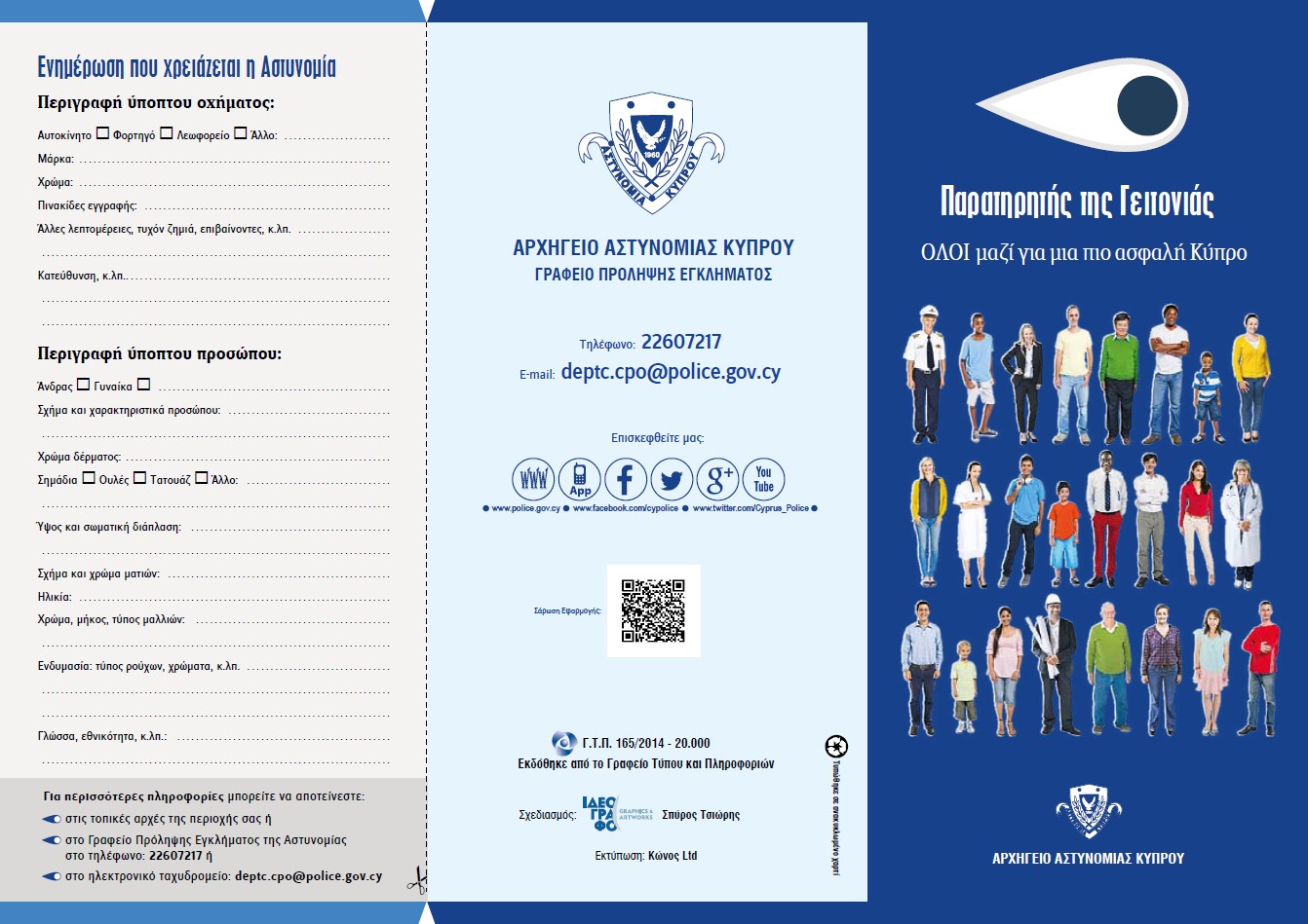 - όπου οι πολίτες παρατηρούν και ενημερώνουν την Αστυνομία για ασυνήθιστες/ύποπτες/εγκληματικές δραστηριότητες που γίνονται στην περιοχή τους